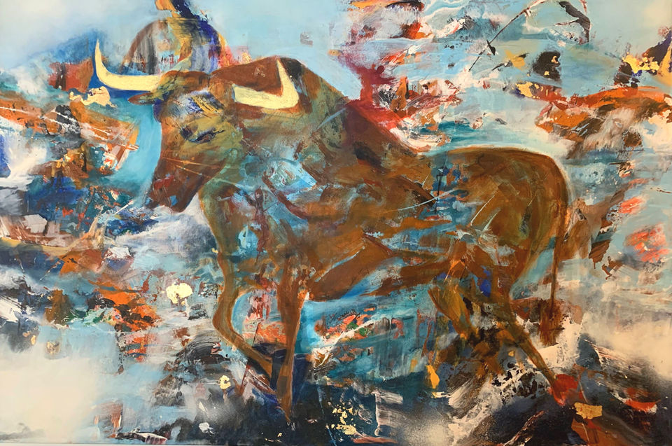 Steinbock und liegende Frau Öl/Acryl mit Blattgold100x100